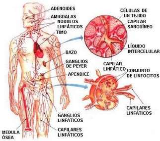 el sistema linfático no es un sistema independiente. Actúa como complemente de la sangre, y corre paralelo al sistema circulatorio. La sangre recoge oxígeno de los pulmones, nutrientes del tracto gastrointestinal y hormonas de las las glándulas endocrinas. La sangre conduce estas sustancias a todos los tejidos del cuerpo, donde se difunden desde los capilares sanguíneos hacia el líquido del tejido. Una vez allí las sustancias nutritivas se transportan a las células de dicho tejido y se produce un intercambio para eliminar los desechos. La linfa recoge entonces los materiales del líquido del tejido, elimina las bacterias y los devuelve al flujo sanguíneo. El tejido linfático que se encuentra en los ganglios, el bazo y la glándula timo tienen la función de proteger el cuerpo de células y sustancias extrañas. El sistema linfático, con su ejército de linfocitos, fagocitos y tejidos productores de anticuerpos, ofrece una línea directa de defensa para el cuerpo.